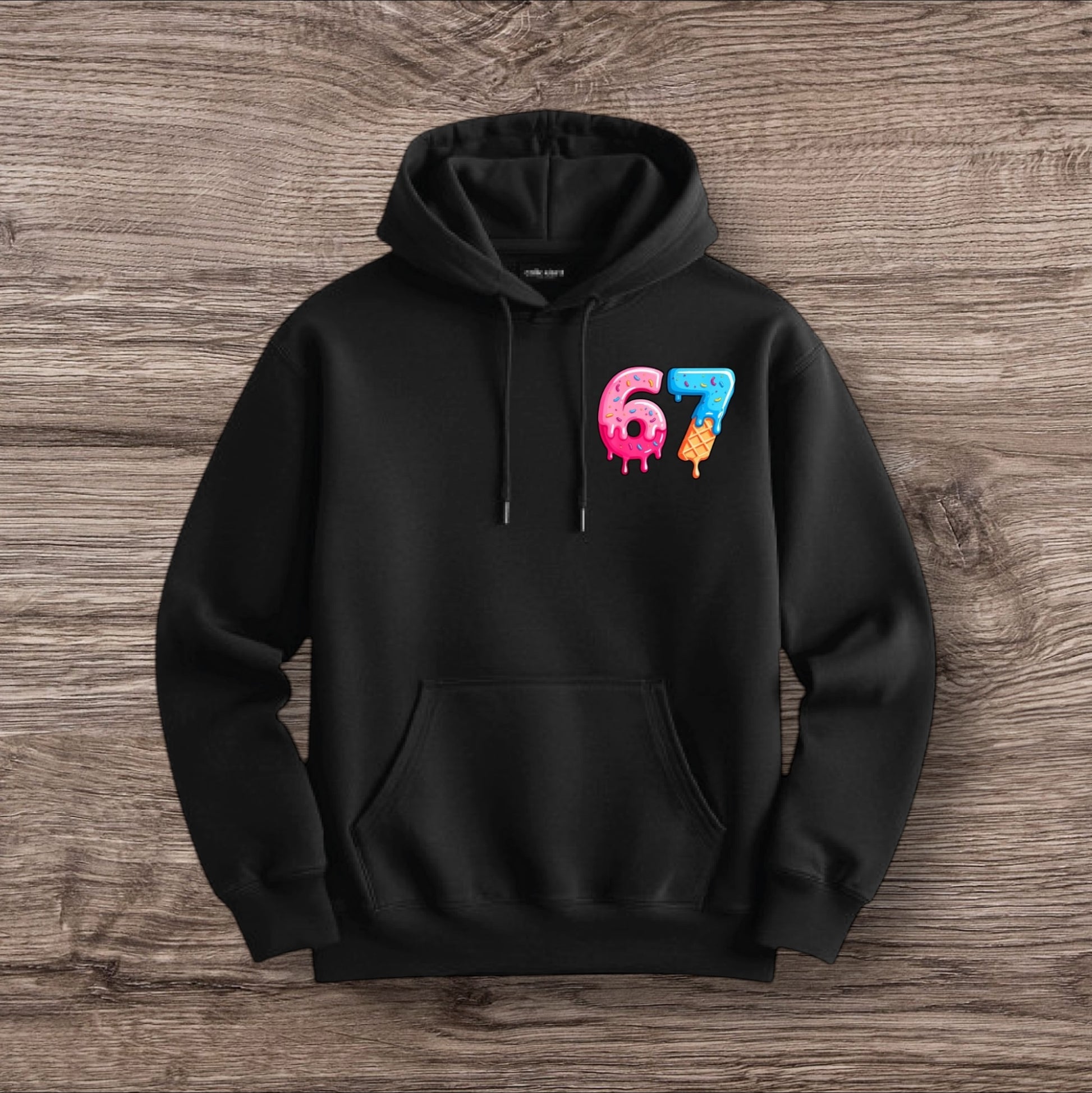 Make a bold statement with our Drip 67 Youth Sweatshirt! This eye-catching black hoodie features a vibrant pink donut '6' and cool blue ice cream cone '7' design that kids and teens will love.